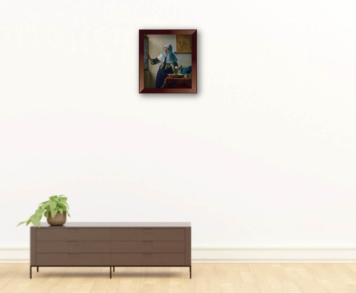 フェルメールの名作「窓辺で水差しを持つ女」の複製画です。色彩や質感までこだわり抜いた印刷技術により、オリジナル作品と見間違うほどの美しさがあります。額縁に入れられた本作品は、部屋のインテリアにも素晴らしいアクセントを与えます。